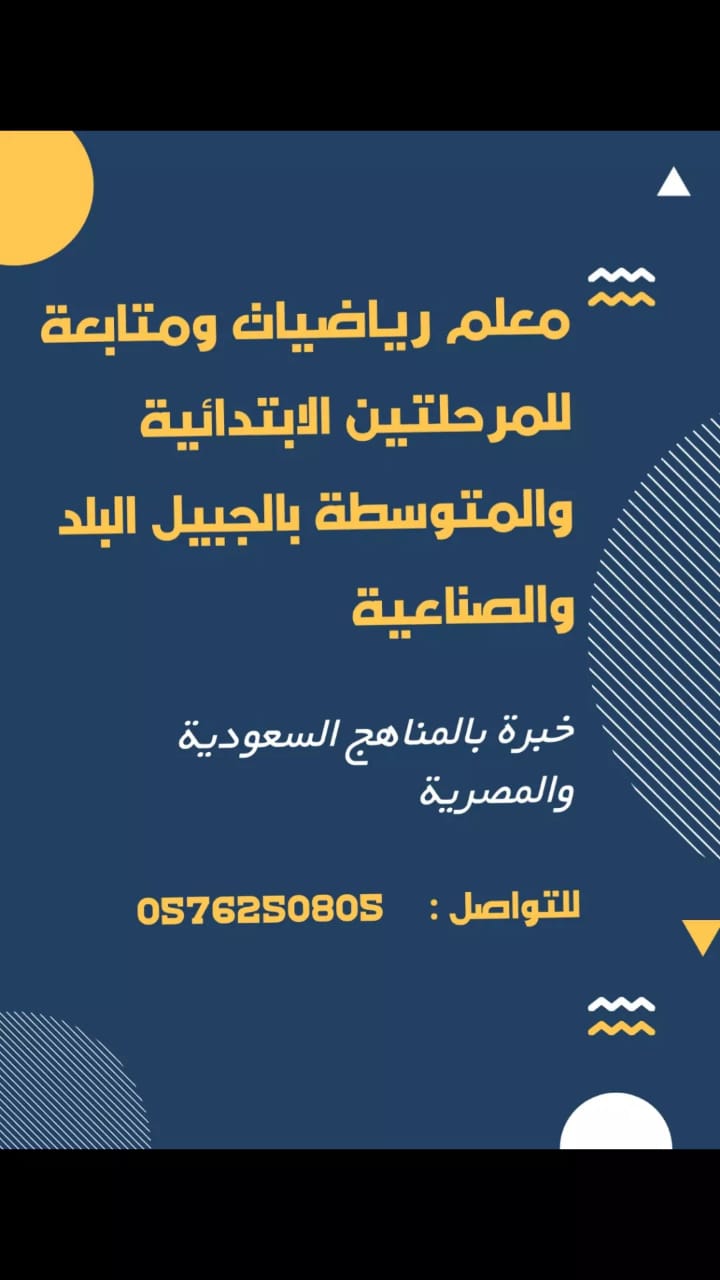 معلم رياضيات ومتابعة لجميع المواد للمرحتلين الابتداءية والمتوسطة بالجبيل الصناعية والبلد . للتواصل : 0576250805