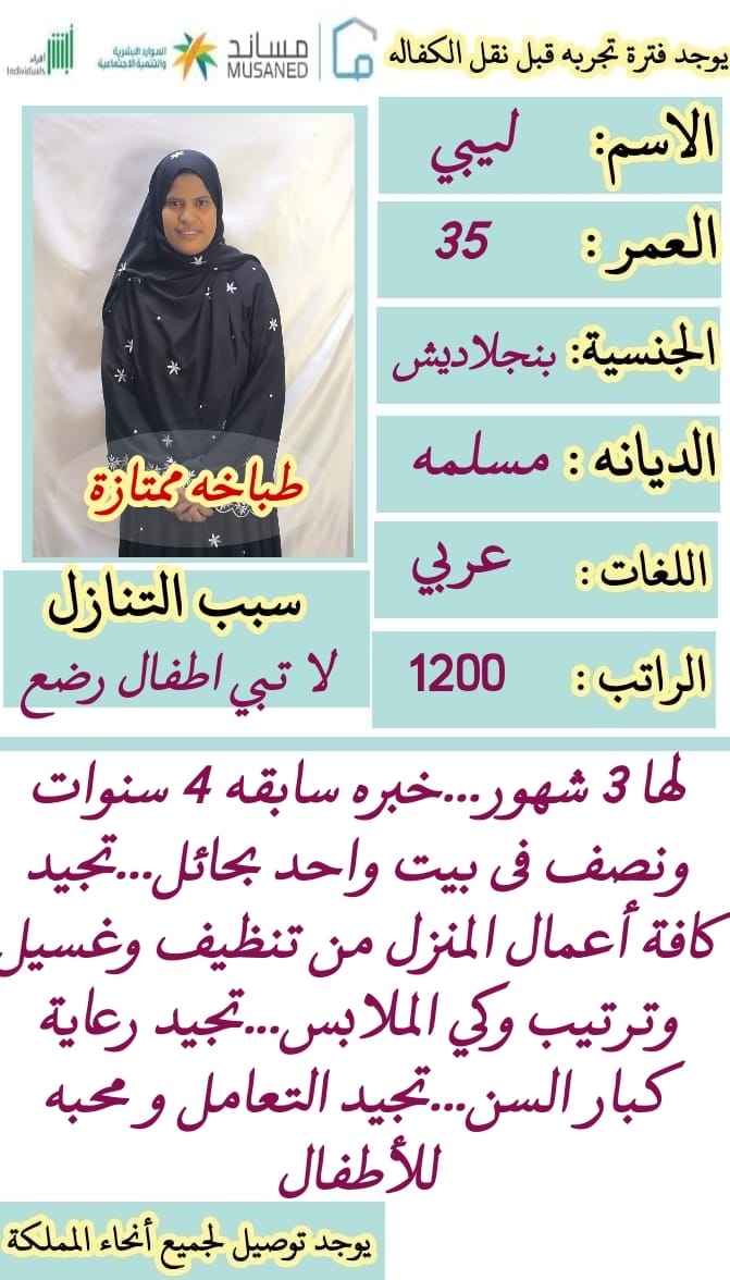 عاملات للتنازل مدربه على نظافه المنازل غسيل كي الملابس بعقد رسمى من مساند ومطلوب خادمات لتنازل مدربه على نظافه المنازل من جميع الجنسيات لتواصل واتساب فقط 0550860739
