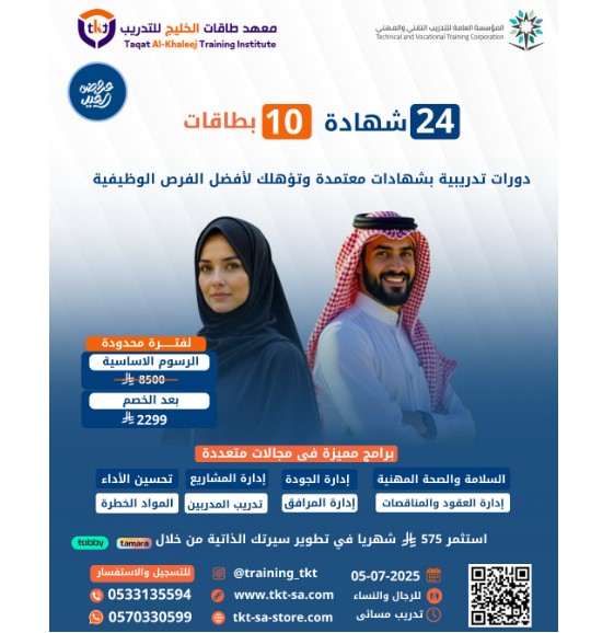عرض24 شهادة (دولية ومحلية ) + 10 بطاقات معتمدة تفاصيل البرامج\ 24 شهادة معتمدة \ 10 بطاقات معتمد\ يغلق التسجيل قبل بداية الدورة بيومين\ مدة الكورس : 18 يوم تدريب\ وقت التدريب : مسائي\ للرجال والنساء\ تقسيط متاح عبر تمارا وتابي\ المدرب: مدرب دولي معتمد\ الاعتمادات: اعتماد المؤسسة العامة للتدريب التقني والمهني واعتمادات بريطانية وامريكية\ تفاصيل الشهادات •أولا الشهادات الدولية\ 1- شهادة الأوشا الأمريكية OSHA 30hr\ 2-شهادة تقييم المخاطر المستوي الثاني من بريطانيا UK Risk Assessment\ 3- شهادة دورة مكافحة الحرائق من بريطانيا UK Fire Safety\ 4- شهادة التحقيق في الحوادث UK Accident Investigation\ 5- شهادة المستوي الثاني في السلامة المهنية HS L2\ 6- شهادة المواد الخطرة HAZMAT\ 7- شهادة معايير إعتماد إدارة السلامة والمرافق FMS\ 8- شهادة (TOT) Training of trainers\ 9-شهادة مؤشرات القياس الرئيسية KPIs\ • ثانيا شهادات من المؤسسة العامة للتدريب التقني والمهني\ 1- شهادة دورة السلامة والصحة المهنية وفق معاير أوشا الأمريكية OSHA-30hr\ 2- شهادة معايير إعتماد إدارة السلامة والمرافق FMS\ 3- شهادة دورة الوقاية من الحرائق وطرق الإطفاء Fire Safety\ 4-شهادة التحقيق في الحوادث\ 5 - شهادة تقييم المخاطر\ 6-شهادة WS\ 7- شهادة MS\ 8- شهادة إدارة العقود والمناقصات\ 9-شهادة المواد الخطرة HAZMAT\ 10-شهادة إدارة المشاريع الإحترافية\ 11-شهادة دورة ايزو ISO\ 12-شهادة تدريب مدربين\ 13-شهادة مؤشرات القياس الرئيسية KPIs\ 14- شهادة السلامة والصحة المهنية وفق معايير WSP البريطانية\ 15-شهادة إجراءات السلامة لكبلات الكهرباء Safe Procedures for Electrical Cables: Handling,\ Installation,Testing and Inspection\ •ثالثا البطاقات\ 1- بطاقة أوشا OSHA-30hr\ 2- بطاقة دورة إدارة المرافق FMS\ 3- بطاقة دورة 45001 ISO\ 4- بطاقة الوقاية من الحرائق وطرق الإطفاء Fire Safety\ 5- بطاقة تقييم المخاطر Risk Assessment\ 6- بطاقة لتحقيق في الحوادث Accident Investigation\ 7- بطاقة المواد الخطرة HAZMAT\ 8- بطاقة دورة إدارة المشاريع PMP\ 9- بطاقة IOSH MS\ 10- بطاقة إدارة العقود CM\ قيمة العرض : فقط 2299 ريال\ بدلا من 8500 ريال ( شامل قيمة الدورة والضريبة والشهادات والتدريب) لأول 7 مشتركين\ يتحمل المتدرب الرسوم الرمزية حال طلب شحن الشهادات\ سارع بالتسجيل قبل اكتمال العدد\ \ للتسجيل والاستفسار \ 0533135594 –\ 0570330599 طاقات الخليج للتدريب\ https://tkt-sa-store.com/EZEQPZQ