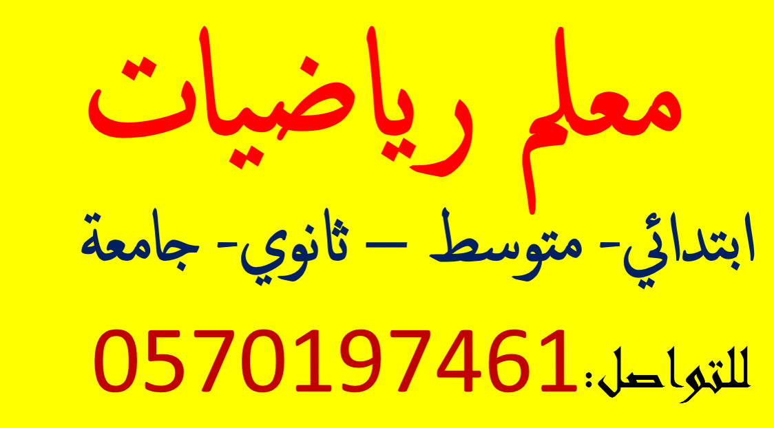 معلم رياضيات وماث أ ايهاب التخصص معلم رياضيات وماث الخبرة 15 عام المهارات تدريس الرياضيات للمراحل الدراسية المختلفة. ابتدائي ومتوسط وجامعة - تدريس الماث للطلاب الذين يرغبون في تحسين مهاراتهم ابتدائي ومتوسط وثانوي وجامعة - التحضير لاختبارات SAT وGAT. مساعدة الطلاب على التحضير للاختبارات الرياضية المختلفة - مساعدة في الواجب واتساب وجوال 0570197461. شرح مقررات الجامعة تفاضل وتكامل ومعدلات تفاضلية
