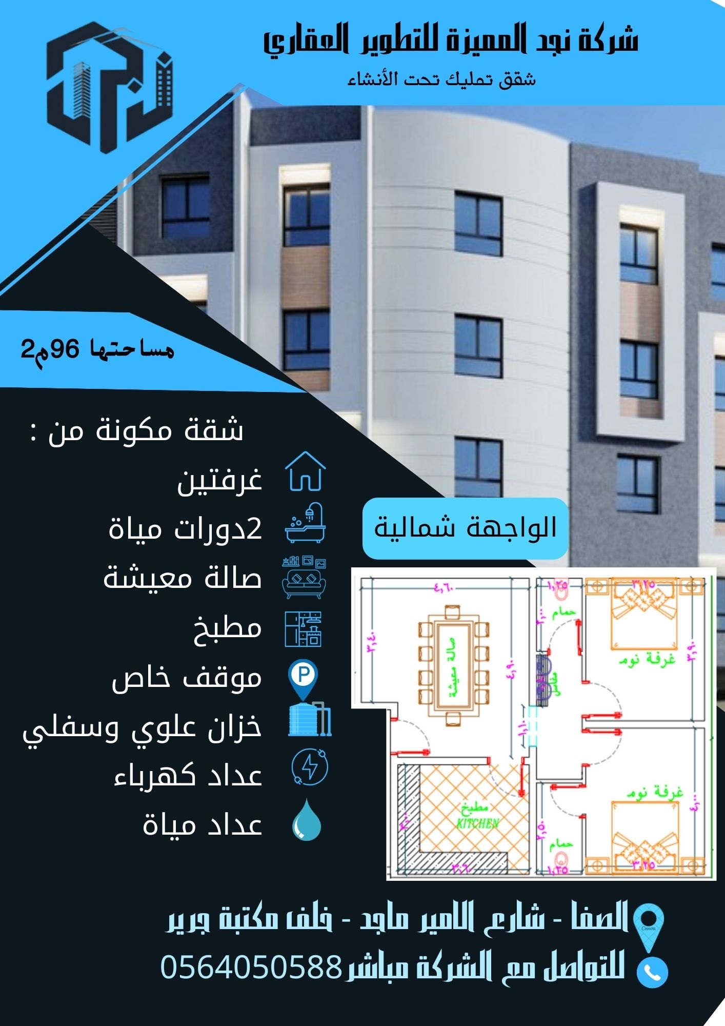 شقة تمليك تحت الانشاء بجده حي الصفا شارع الامير ماجد خلف مكتبة جرير شقة مكونة من : غرفتين 2دورات مياة صالة معيشة مطبخ موقف خاص خزان علوي وسفلي عداد كهرباء عداد مياة واجهة شمالية مساحته 96م2 للتواصل مع الشركه مباشر 0564050588