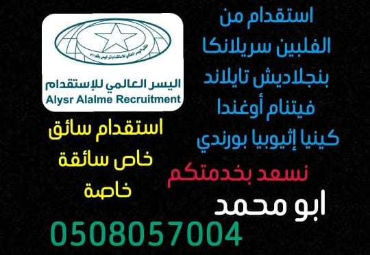 اليسر العالمي للاستقدام ١_ استقدام عاملات منزلية من الفلبين سريلانكا بنجلاديش تايلاند فيتنام أوغندا كينيا إثيوبيا بورندي ٢_ استقدام سائق خاص من الهند والسودان ٣_ اسرع فترة استقدام بالمملكة معتمد من مساند بالرياض ونخدم جميع مناطق المملكة ٤_ استقدام رعاية مسن او مسنة تواصل 0508057004