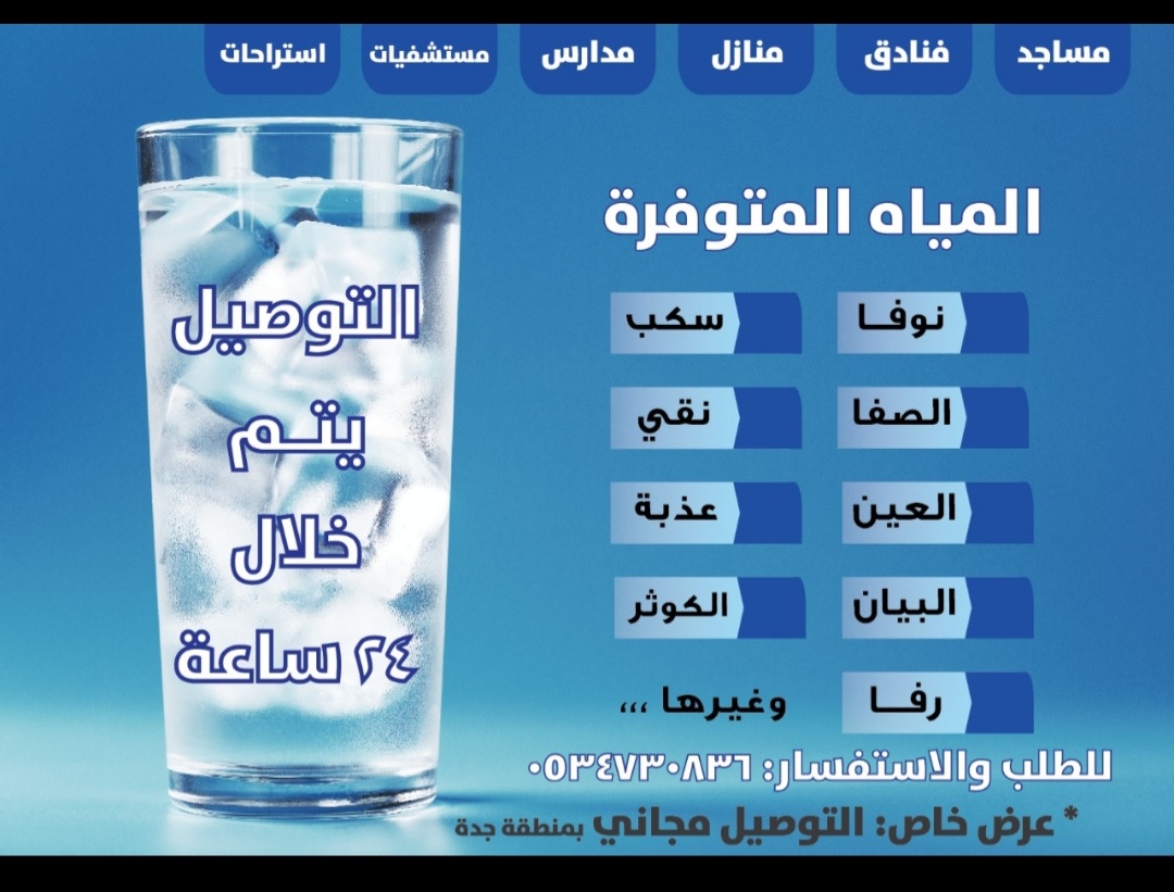 ابو أيمن لتوزيع مياه ابو نص متوفر لدينا جميع ماركات مياه مثل صفا ، نوفا ، العين ، اكترا ، و غيرها .... التوصيل مجاني التوصيل مجاني و بأي كمية للتواصل واتساب فقط لو تكرمتوا 0534730836